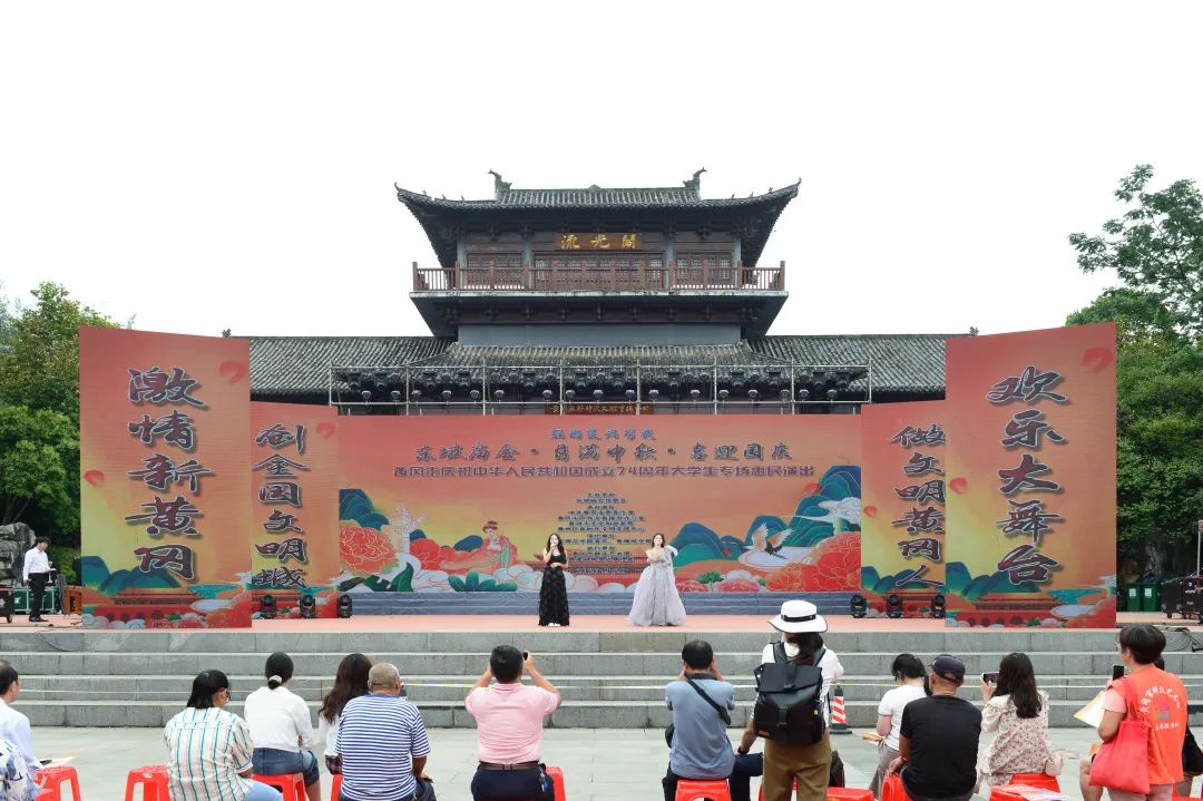 两场演出都是大学生专场,以年轻化为主调,青春阳光、朝气蓬勃、靓丽耀眼,吸引众多市民和游客驻足观看。演出节目形式多样、丰富多彩,展现了当代黄冈人民新活力、新面貌和新风尚,表达了对祖国母亲最深情的问候和最真挚的祝福。精彩演出给节日休闲市民带来一场文化视觉盛宴,丰富了人民群众精神文化生活,营造了团结、欢乐、祥和、喜庆的节日氛围。