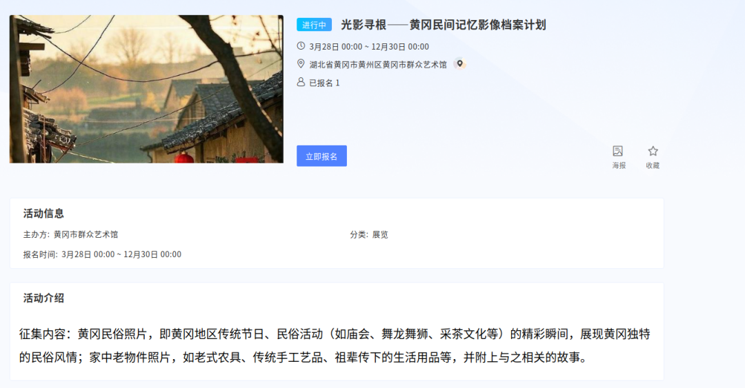 亲爱的朋友们 你是否曾用镜头捕捉过黄冈民俗的动人瞬间? 是否家中珍藏着承载岁月故事的老物件? 现在,机会来了! 黄冈市民俗博物馆 以“二十四节气里的黄冈密码”为主题 开启“光影寻根—黄冈民间记忆影像档案计划” 诚邀您用影像参与这场民俗文化的传承之旅 活动背景 “二十四节气里的黄冈密码”,以岁时节令为经,以非遗技艺为纬,通过各项主题体验解码民俗基因,实现“一月一非遗,一季一传承”的立体化传播。本次“光影寻根”活动作为3月寻迹篇的重要环节,旨在用影像记录黄冈民俗,留存珍贵的民间记忆。 征集内容 例:奶奶总爱用一把木梳,给我梳小辫。木梳纹理清晰,带着淡淡木香。后来她病重,我在外地求学。一次回家,看到木梳静静躺在她枕边。如今,抚摸这把木梳,我仿佛能感受到奶奶指尖的温度,它承载着那些温暖的清晨,和她未说出口的思念 。 黄冈民俗照片,即黄冈地区传统节日、民俗活动(如庙会、舞龙舞狮、采茶文化等)的精彩瞬间,展现黄冈独特的民俗风情;家中老物件照片,如老式农具、传统手工艺品、祖辈传下的生活用品等,并附上与之相关的故事。 展出安排 收集到的优秀作品将在“群文黄冈”公众号或馆内展厅进行展示,为了更全面地展现各县市区的民俗特色,每个月还会推出一个县市区的摄影作品专栏,深入挖掘和呈现各地独特的民俗文化魅力。 组织机构 主办单位: 黄冈市群众艺术馆(市民俗博物馆、市非遗中心) 协办单位: 各县市区文化馆(非遗中心) 活动时间 即日起至2026年1月31日。 参与人群 学生、游客以及所有热爱黄冈文化、热衷摄影的朋友们。 报名方式 以下两种报名方式: 1、点击下方小程序,将拍摄的照片及对应的故事按要求上传,请仔细填写必选项,如“姓名、性别、联系方式、作品名称、拍摄时间、拍摄地点、摄影作品、照片的故事”等。若投稿人有多个作品,请重复此操作,每个照片故事对应每张(组)照片。 2、下载下方表格并填写,将拍摄的照片及表格发送至指定邮箱717043872@qq.com,联系电话:0713-8812705。注:表格内容需填写完整后再报送,图片用附件上传。若有多个作品投稿,请分开填报。 用影像寻根,让记忆永恒 期待您的踊跃参与 一起为黄冈民俗文化留下生动的影像档案 文字编辑:徐平 王思媛 审核:侯啸澜