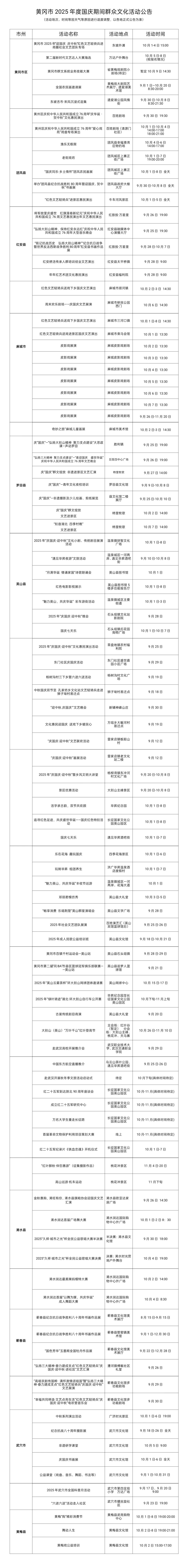 喜迎国庆 欢度中秋 NATIONAL DAY & MID-AUTUMN 2025年国庆、中秋双节将至,为热烈庆祝中华人民共和国成立76周年,传承弘扬中华优秀传统文化,进一步丰富居民群众精神文化生活,营造欢乐喜庆的节日氛围,黄冈市将举办丰富多彩的群文活动。本次系列活动涵盖多个类别,旨在通过多元化的活动载体,切实提升群众的获得感与幸福感,现将国庆中秋期间活动公告如下。 注:活动场次、时间等因天气等原因进行适度调整,以各地正式公告为准 -END- 文字编辑:王思媛 初审:徐平 终审:侯啸澜
